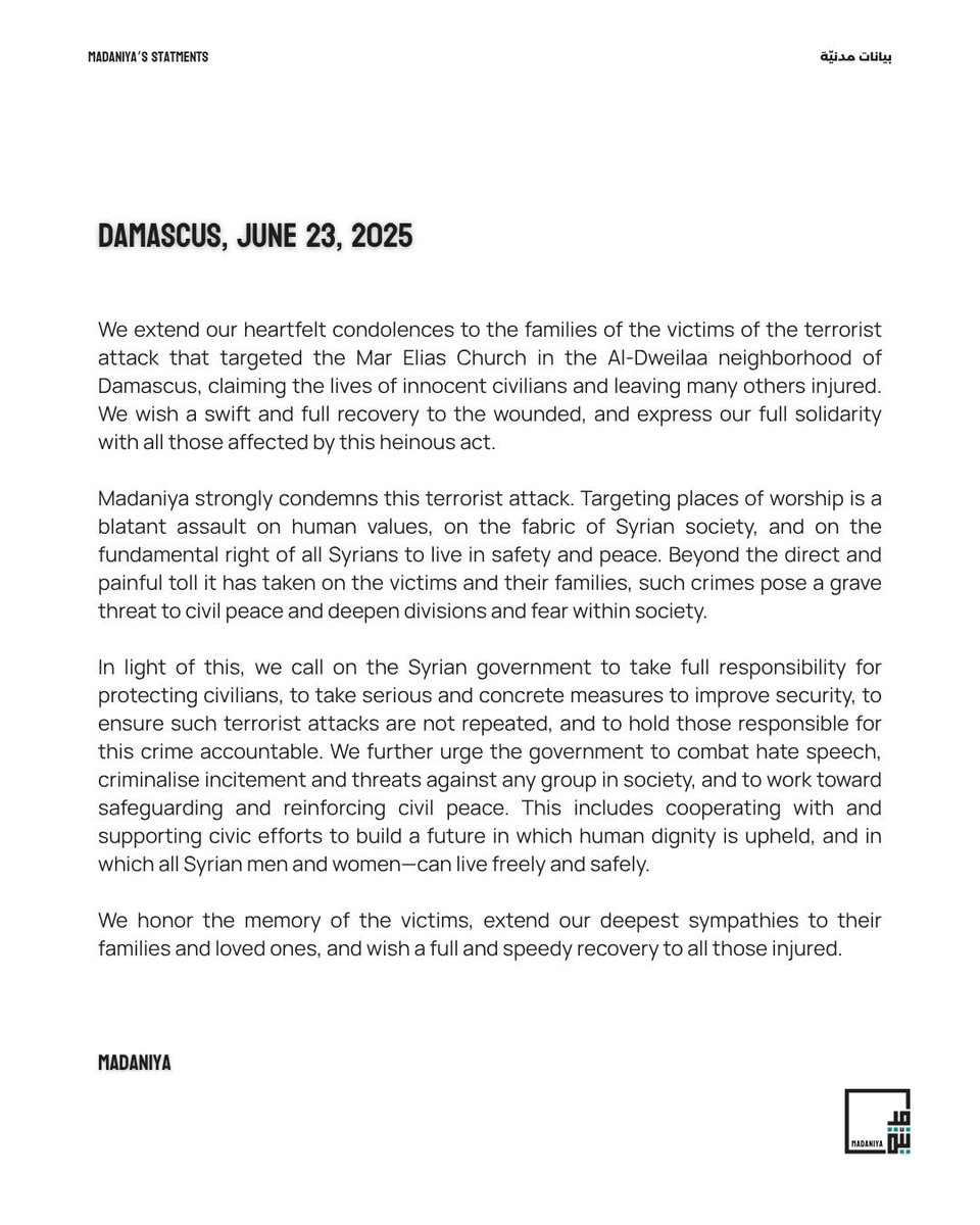 Madaniya’s Position Statement on the Terrorist Attack on Mar Elias Church