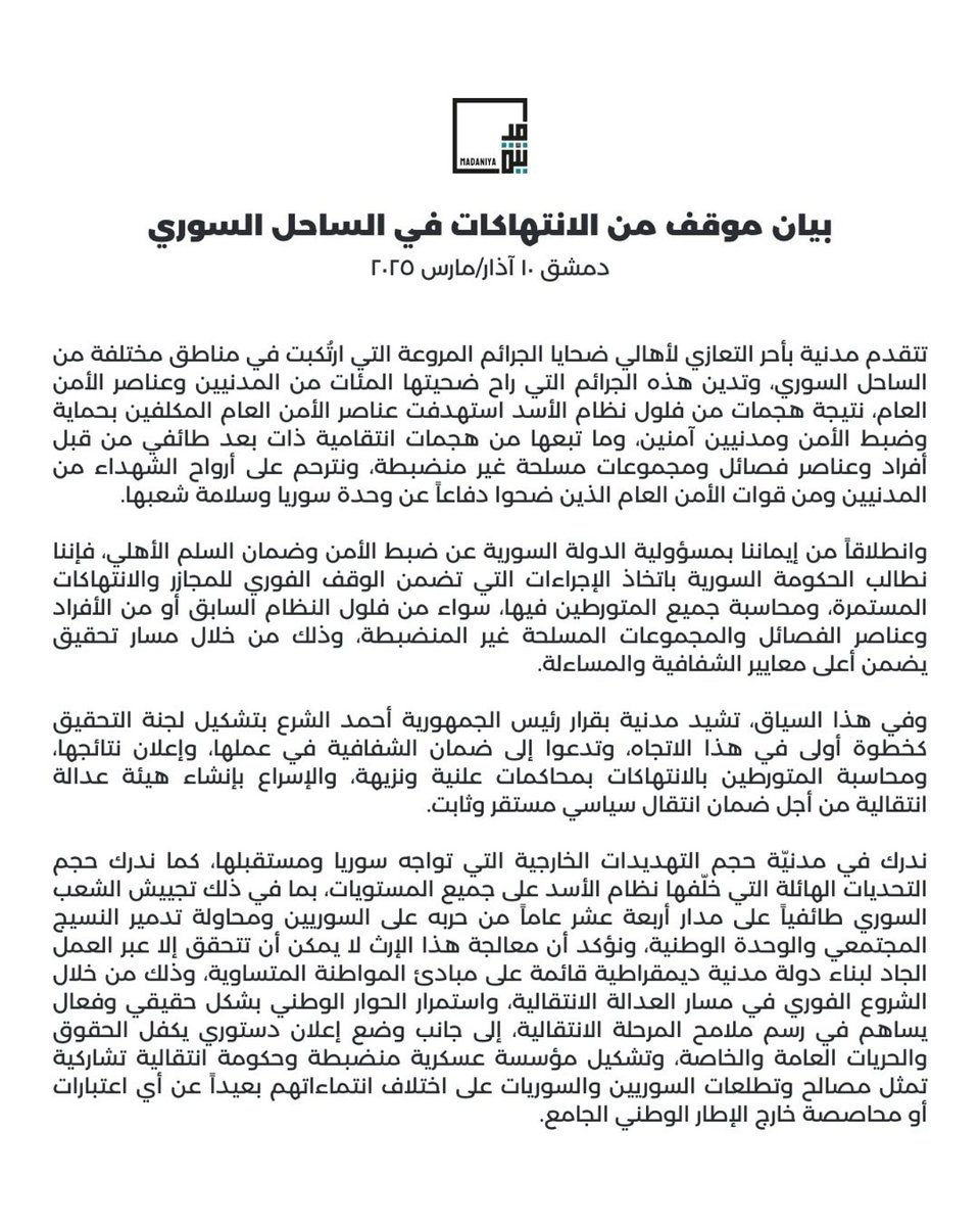Madaniya’s Position Statement on Violations in the Syrian Coast